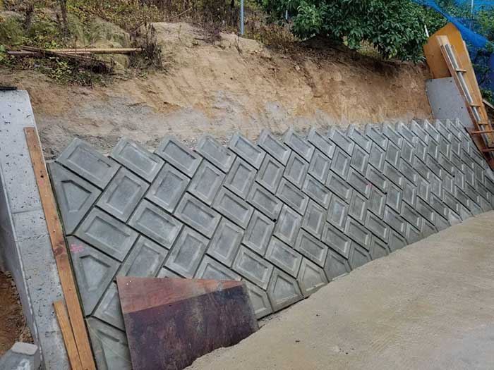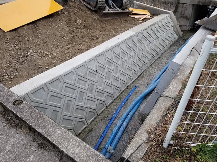 擁壁工事と同じく、土砂が崩れるのを防ぐ工事です。ブロックを積み上げてゆく工法のため、費用が比較的安く、施工期間も短く設定することが可能です。また、形や大きさなどが多彩で、お好みに合わせて施工ができます。